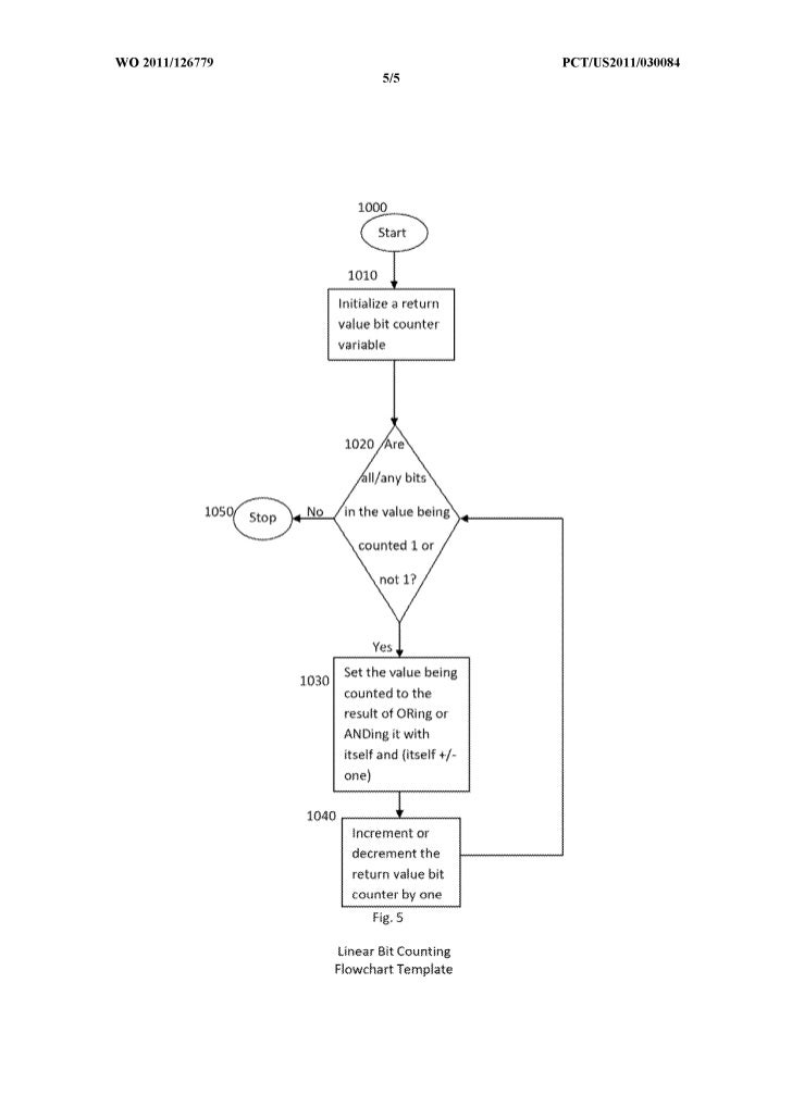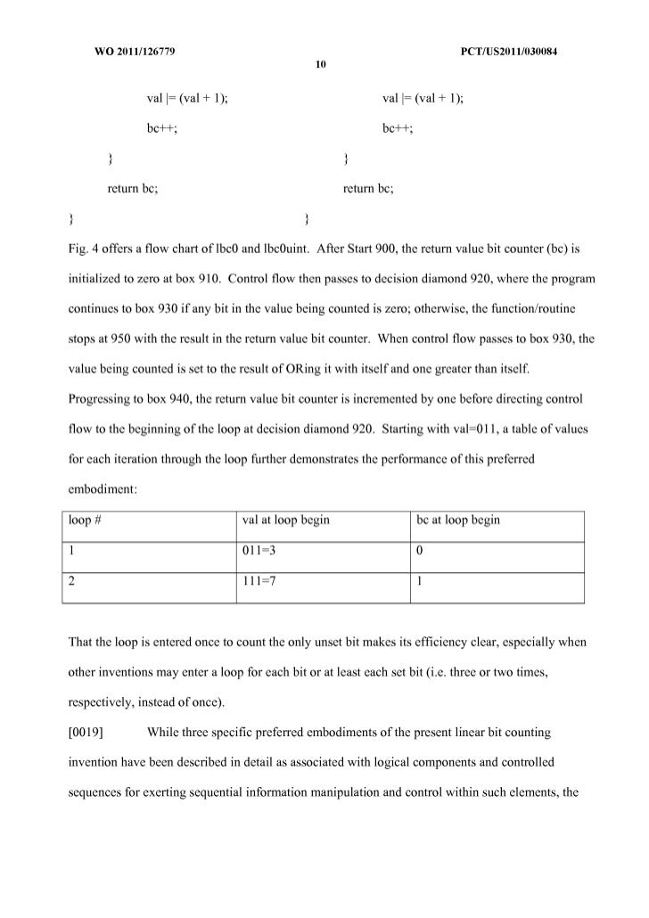 11. 11. WO 2011/126779 peT/US20111030084 10 val 1= (val + 1); val 1= (val + 1); bc++; bc++; } } return bc; return bc; } } Fig. 4 offers a flow chart of lbcO and lbcOuint. After Start 900, the return value bit counter (bc) is initialized to zero at box 910. Control flow then passes to decision diamond 920, where the program continues to box 930 if any bit in the value being counted is zero; otherwise, the function/routine stops at 950 with the result in the return value bit counter. When control flow passes to box 930, the value being counted is set to the result of DRing it with itself and one greater than itself. Progressing to box 940, the return value bit counter is incremented by one before directing control flow to the beginning of the loop at decision diamond 920. Starting with val=Oll, a table of values for each iteration through the loop further demonstrates the performance of this preferred embodiment: loop # val at loop begin bc at loop begin 1 011=3 0 2 111=7 1 That the loop is entered once to count the only unset bit makes its efficiency clear, especially when other inventions may enter a loop for each bit or at least each set bit (i.e. three or two times, respectively, instead of once). [0019] While three specific preferred embodiments of the present linear bit counting invention have been described in detail as associated with logical components and controlled sequences for exerting sequential information manipulation and control within such elements, the
