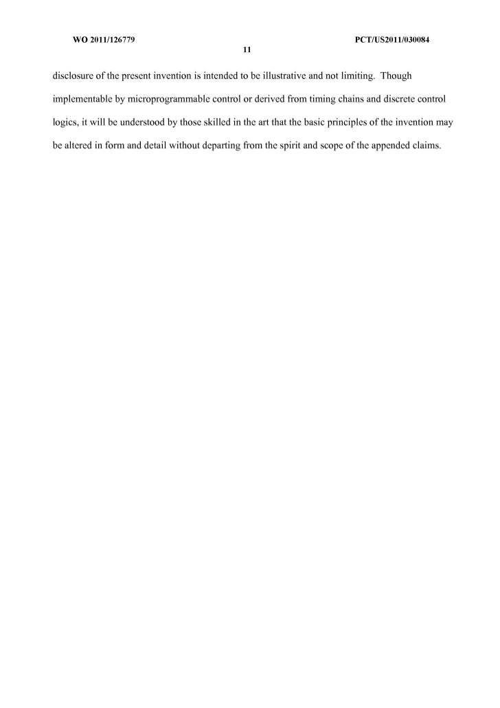 12. 12. WO 2011/126779 peT/US20111030084 11 disclosure of the present invention is intended to be illustrative and not limiting. Though implementable by microprogrammable control or derived from timing chains and discrete control logics, it will be understood by those skilled in the art that the basic principles of the invention may be altered in form and detail without departing from the spirit and scope of the appended claims.