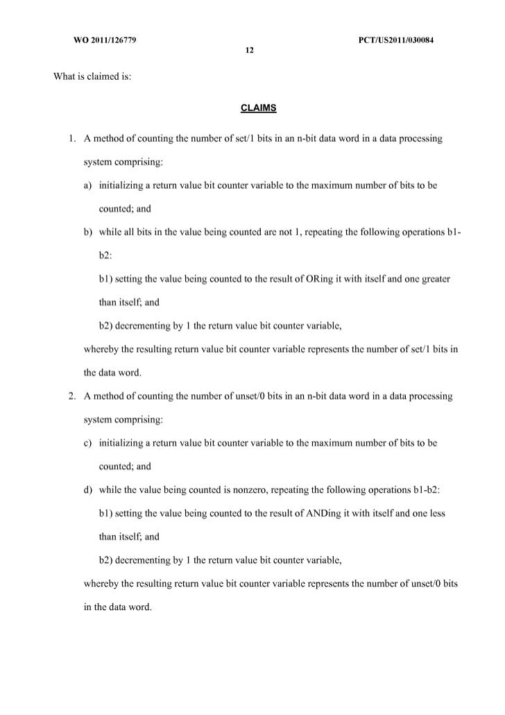 13. 13. WO 2011/126779 peT/US20111030084 12 What is claimed is: CLAIMS 1. A method of counting the number of set/1 bits in an n-bit data word in a data processing system comprising: a) initializing a return value bit counter variable to the maximum number of bits to be counted; and b) while all bits in the value being counted are not 1, repeating the following operations b 1- b2: b 1) setting the value being counted to the result of DRing it with itself and one greater than itself; and b2) decrementing by 1 the return value bit counter variable, whereby the resulting return value bit counter variable represents the number of set/1 bits in the data word. 2. A method of counting the number ofunset/O bits in an n-bit data word in a data processing system comprising: c) initializing a return value bit counter variable to the maximum number of bits to be counted; and d) while the value being counted is nonzero, repeating the following operations b1-b2: b 1) setting the value being counted to the result of ANDing it with itself and one less than itself; and b2) decrementing by 1 the return value bit counter variable, whereby the resulting return value bit counter variable represents the number of unset/O bits in the data word.