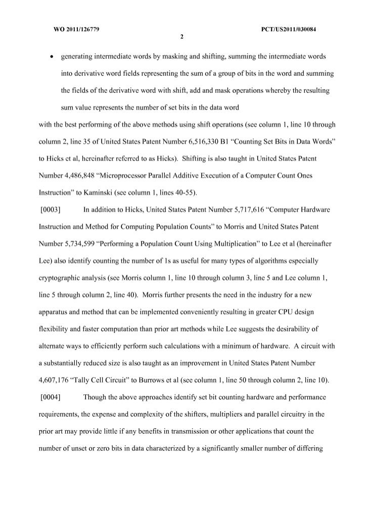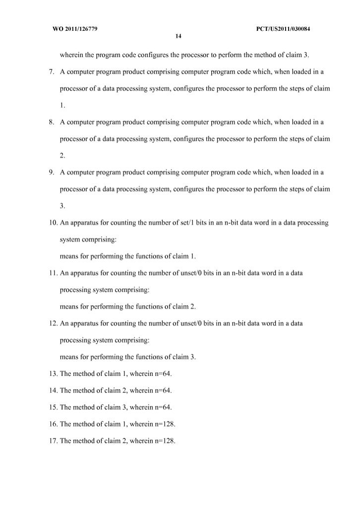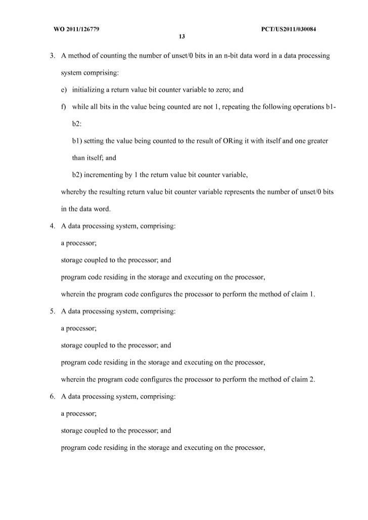 14. 14. WO 2011/126779 peT/US20111030084 13 3. A method of counting the number ofunset/O bits in an n-bit data word in a data processing system comprising: e) initializing a return value bit counter variable to zero; and f) while all bits in the value being counted are not 1, repeating the following operations b 1- b2: b 1) setting the value being counted to the result of DRing it with itself and one greater than itself; and b2) incrementing by 1 the return value bit counter variable, whereby the resulting return value bit counter variable represents the number of unset/O bits in the data word. 4. A data processing system, comprising: a processor; storage coupled to the processor; and program code residing in the storage and executing on the processor, wherein the program code configures the processor to perform the method of claim 1. 5. A data processing system, comprising: a processor; storage coupled to the processor; and program code residing in the storage and executing on the processor, wherein the program code configures the processor to perform the method of claim 2. 6. A data processing system, comprising: a processor; storage coupled to the processor; and program code residing in the storage and executing on the processor,