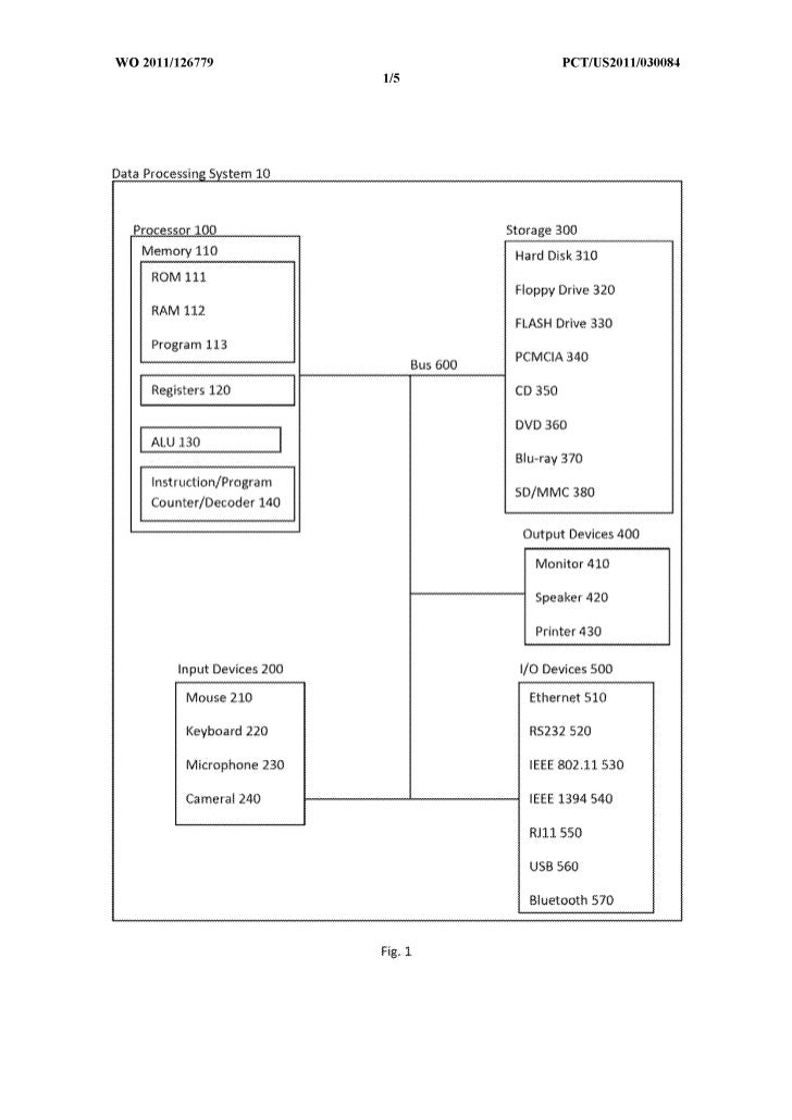 17. 17. WO 2011/126779 peT/US20111030084 115 Data Processing System 10 Processor 100 Storage 300 Memory 110 Hard Disk 310 ROM 111 Floppy Drive 320 RAM 112 FLASH Drive 330 Program 113 PCMCIA340 Bus 600 Registers 120 CD 350 DVD360 AlU 130 Blu-rav 370 Inst fuction/Progra m SD/MMC 380 Counter/Decoder 140 Output Devices 400 Monitor 410 Speaker 420 Printer 430 Input Devices 200 I/O Devices SOD Mouse 210 Ethernet 510 Keyboard 220 R5232520 Microphone 230 IEEE 802.11 530 Cameral 240 IEEEB94540 RJ11550 USB 560 Bluetooth 570 Fig, 1