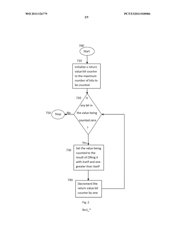 18. 18. WO 2011/126779 peTIUS20111030084 2/5 Initialize a return value bit counter to the maximum number of bits to be counted 750 Yes Set the value being 730 counted to the result of ORing it with itself and one greater than itself 740 Decrement the return value bit COlmter by one Flg.2