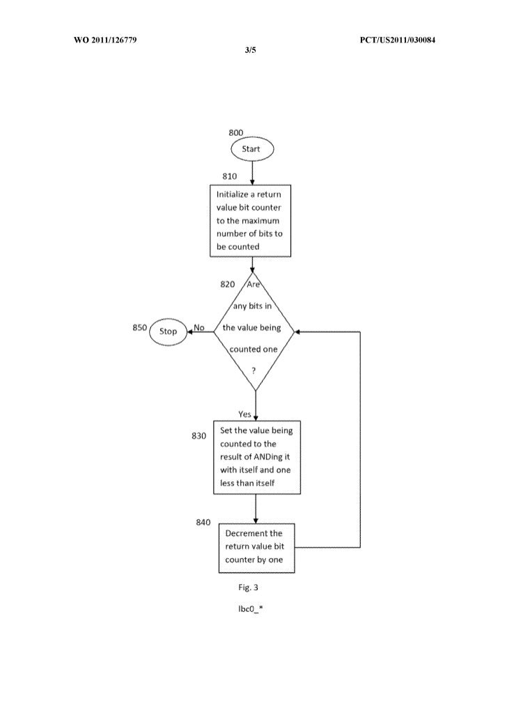 10. 10. WO 2011/126779 peT/US20111030084 9 Fig. 3 offers a flow chart of lbcO_ and lbcO_uint. After Start 800, the return value bit counter (bc) is initialized to the maximum number of bits to be counted at box 810. Control flow then passes to decision diamond 820, where the program continues to box 830 if any bits in the value being counted are one; otherwise, the function/routine stops at 850 with the result in the return value bit counter. When control flow passes to box 830, the value being counted is set to the result of ANDing it with itself and one less than itself. Progressing to box 840, the return value bit counter is decremented by one before directing control flow to the beginning of the loop at decision diamond 820. Starting with val=OOl, a table of values for each iteration through the loop further demonstrates the performance of this preferred embodiment: loop # val at loop begin bc at loop begin 1 001=1 3 2 0 2 That the loop is entered only once to count the two unset bits makes its efficiency clear, especially when other inventions may enter a loop for each bit or at least each unset bit (i.e. three or two times, respectively, instead of once). [0018] Preferred Embodiment 3: Counting the zeros in a heavily populated value, such as 011: Java CIC++ public int lbcO(int val) unsigned int lbcOuint(unsigned int val) { { int bc = 0; unsigned int bc = 0; while (val != Ox111) II loop begin while (val != Ox111) II loop begin { {
