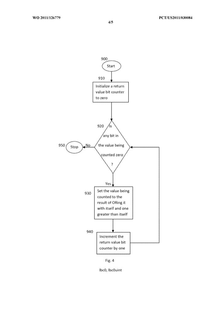 20. 20. WO 2011/126779 peT/US20111030084 4/5 Initialize a return value bit counter to zero 950 Yes Set the value being 930 counted to the result of ORing it with itself and one greater than itself 940 Increment the return value bit COlmter by one Flg.4 IbcO,lbcOuint
