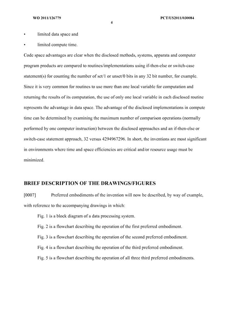 5. 5. WO 2011/126779 peT/US20111030084 4 • limited data space and • limited compute time. Code space advantages are clear when the disclosed methods, systems, apparata and computer program products are compared to routines/implementations using if-then-else or switch-case statement(s) for counting the number of set/1 or unset/O bits in any 32 bit number, for example. Since it is very common for routines to use more than one local variable for computation and returning the results of its computation, the use of only one local variable in each disclosed routine represents the advantage in data space. The advantage of the disclosed implementations in compute time can be determined by examining the maximum number of comparison operations (normally performed by one computer instruction) between the disclosed approaches and an if-then-else or switch-case statement approach, 32 versus 4294967296. In short, the inventions are most significant in environments where time and space efficiencies are critical and/or resource usage must be minimized. BRIEF DESCRIPTION OF THE DRAWINGS/FIGURES [0007] Preferred embodiments of the invention will now be described, by way of example, with reference to the accompanying drawings in which: Fig. 1 is a block diagram of a data processing system. Fig. 2 is a flowchart describing the operation of the first preferred embodiment. Fig. 3 is a flowchart describing the operation of the second preferred embodiment. Fig. 4 is a flowchart describing the operation of the third preferred embodiment. Fig. 5 is a flowchart describing the operation of all three third preferred embodiments.