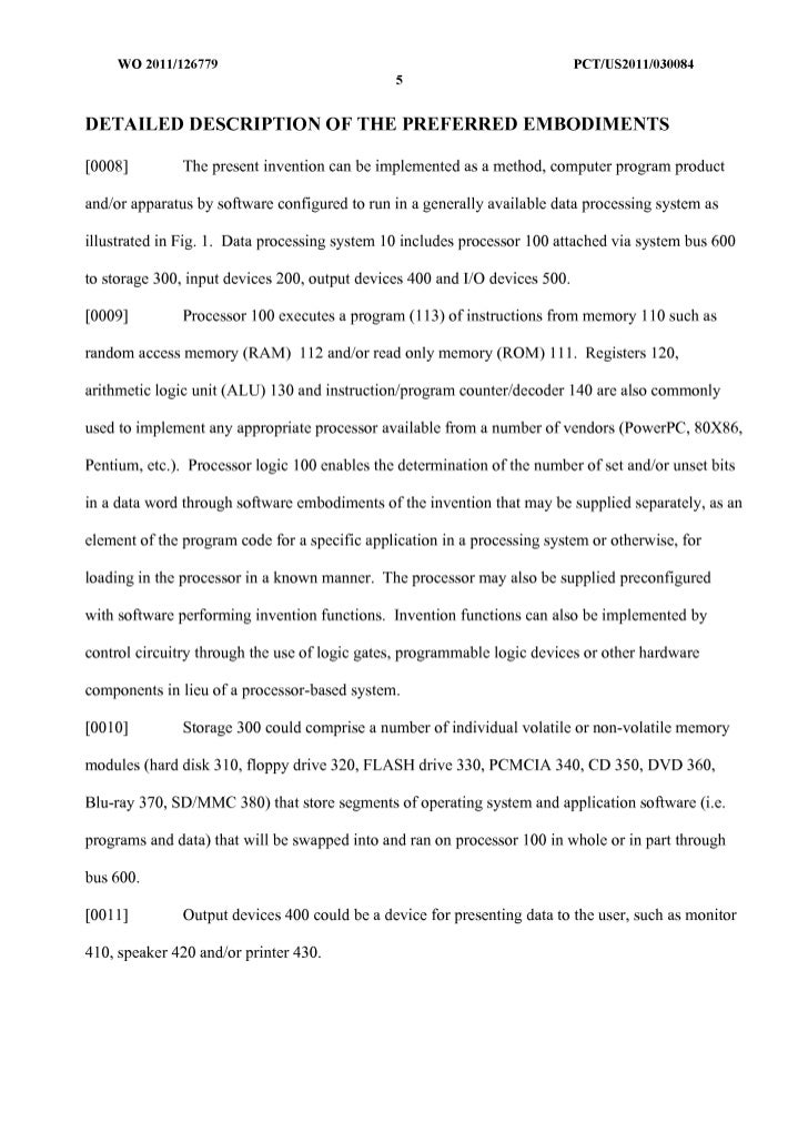 6. 6. WO 2011/126779 peT/US20111030084 5 DETAILED DESCRIPTION OF THE PREFERRED EMBODIMENTS [0008] The present invention can be implemented as a method, computer program product and/or apparatus by software configured to run in a generally available data processing system as illustrated in Fig. 1. Data processing system 10 includes processor 100 attached via system bus 600 to storage 300, input devices 200, output devices 400 and I/O devices 500. [0009] Processor 100 executes a program (113) of instructions from memory 110 such as random access memory (RAM) 112 and/or read only memory (ROM) 111. Registers 120, arithmetic logic unit (ALU) 130 and instruction/program counter/decoder 140 are also commonly used to implement any appropriate processor available from a number of vendors (PowerPC, 80X86, Pentium, etc.). Processor logic 100 enables the determination of the number of set and/or unset bits in a data word through software embodiments of the invention that may be supplied separately, as an element of the program code for a specific application in a processing system or otherwise, for loading in the processor in a known manner. The processor may also be supplied preconfigured with software performing invention functions. Invention functions can also be implemented by control circuitry through the use of logic gates, programmable logic devices or other hardware components in lieu of a processor-based system. [0010] Storage 300 could comprise a number of individual volatile or non-volatile memory modules (hard disk 310, floppy drive 320, FLASH drive 330, PCMCIA 340, CD 350, DVD 360, Blu-ray 370, SD/MMC 380) that store segments of operating system and application software (i.e. programs and data) that will be swapped into and ran on processor 100 in whole or in part through bus 600. [0011] Output devices 400 could be a device for presenting data to the user, such as monitor 410, speaker 420 and/or printer 430.