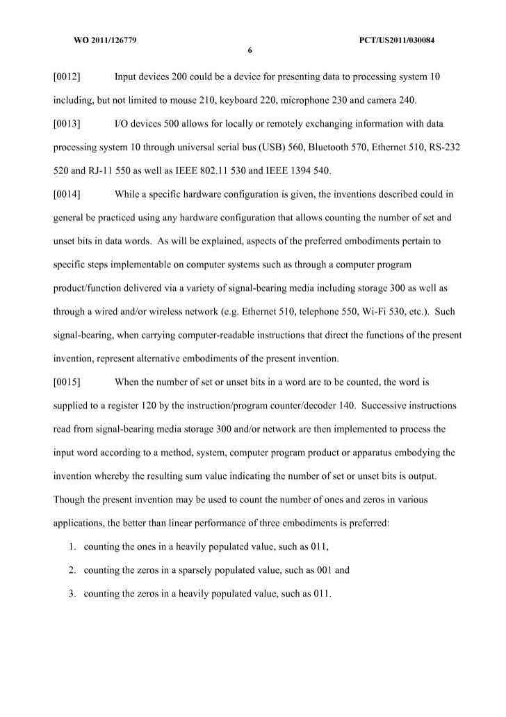 7. 7. WO 2011/126779 peT/US20111030084 6 [0012] Input devices 200 could be a device for presenting data to processing system 10 including, but not limited to mouse 210, keyboard 220, microphone 230 and camera 240. [0013] I/O devices 500 allows for locally or remotely exchanging information with data processing system 10 through universal serial bus (USB) 560, Bluetooth 570, Ethernet 510, RS-232 520 and RJ-ll 550 as well as IEEE 802.11 530 and IEEE 1394540. [0014] While a specific hardware configuration is given, the inventions described could in general be practiced using any hardware configuration that allows counting the number of set and unset bits in data words. As will be explained, aspects of the preferred embodiments pertain to specific steps implementable on computer systems such as through a computer program product/function delivered via a variety of signal-bearing media including storage 300 as well as through a wired and/or wireless network (e.g. Ethernet 510, telephone 550, Wi-Fi 530, etc.). Such signal-bearing, when carrying computer-readable instructions that direct the functions of the present invention, represent alternative embodiments of the present invention. [0015] When the number of set or unset bits in a word are to be counted, the word is supplied to a register 120 by the instruction/program counter/decoder 140. Successive instructions read from signal-bearing media storage 300 and/or network are then implemented to process the input word according to a method, system, computer program product or apparatus embodying the invention whereby the resulting sum value indicating the number of set or unset bits is output. Though the present invention may be used to count the number of ones and zeros in various applications, the better than linear performance of three embodiments is preferred: 1. counting the ones in a heavily populated value, such as 011, 2. counting the zeros in a sparsely populated value, such as 001 and 3. counting the zeros in a heavily populated value, such as 011.