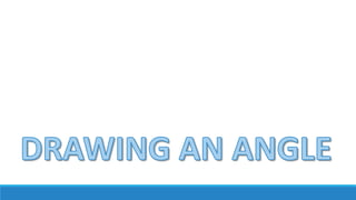 The document provides instructions for drawing angles using a protractor and scale. It instructs the reader to draw a line using a scale, place the protractor on the line with its center on the edge of the line, mark the desired angle measurement, and join the lines. It then lists several angle measurements and asks if the reader can draw an unspecified angle.