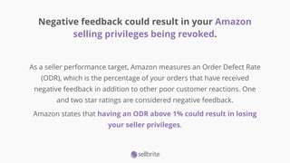 7. 7. Negative feedback could result in your Amazon selling privileges being revoked. As a seller performance target, Amazon measures an Order Defect Rate (ODR), which is the percentage of your orders that have received negative feedback in addition to other poor customer reactions. One and two star ratings are considered negative feedback. Amazon states that having an ODR above 1% could result in losing your seller privileges.