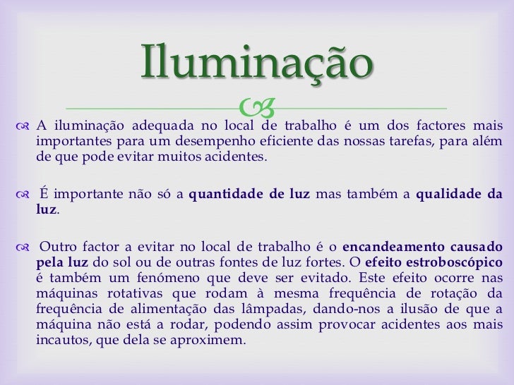 11. 11. Iluminação  A iluminação adequada no local de trabalho é um dos factores mais importantes para um desempenho eficiente das nossas tarefas, para além de que pode evitar muitos acidentes. É importante não só a quantidade de luz mas também a qualidade da luz. Outro factor a evitar no local de trabalho é o encandeamento causado pela luz do sol ou de outras fontes de luz fortes. O efeito estroboscópico é também um fenómeno que deve ser evitado. Este efeito ocorre nas máquinas rotativas que rodam à mesma frequência de rotação da frequência de alimentação das lâmpadas, dando-nos a ilusão de que a máquina não está a rodar, podendo assim provocar acidentes aos mais incautos, que dela se aproximem.