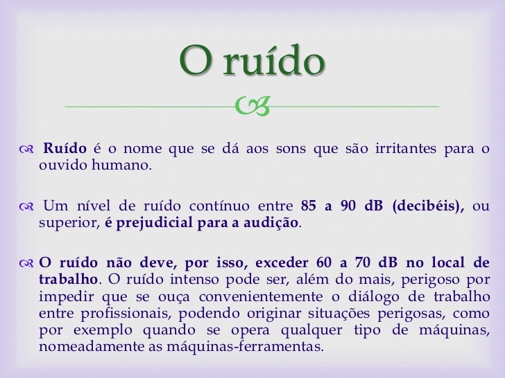 12. 12. O ruído  Ruído é o nome que se dá aos sons que são irritantes para o ouvido humano. Um nível de ruído contínuo entre 85 a 90 dB (decibéis), ou superior, é prejudicial para a audição. O ruído não deve, por isso, exceder 60 a 70 dB no local de trabalho. O ruído intenso pode ser, além do mais, perigoso por impedir que se ouça convenientemente o diálogo de trabalho entre profissionais, podendo originar situações perigosas, como por exemplo quando se opera qualquer tipo de máquinas, nomeadamente as máquinas-ferramentas.