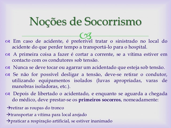 14. 14. Noções de Socorrismo  Em caso de acidente, é preferível tratar o sinistrado no local do acidente do que perder tempo a transportá-lo para o hospital. A primeira coisa a fazer é cortar a corrente, se a vítima estiver em contacto com os condutores sob tensão. Nunca se deve tocar ou agarrar um acidentado que esteja sob tensão. Se não for possível desligar a tensão, deve-se retirar o condutor, utilizando equipamentos isolados (luvas apropriadas, varas de manobras isoladoras, etc.). Depois de libertado o acidentado, e enquanto se aguarda a chegada do médico, deve prestar-se os primeiros socorros, nomeadamente:retirar as roupas do troncotransportar a vítima para local arejadopraticar a respiração artificial, se estiver inanimado