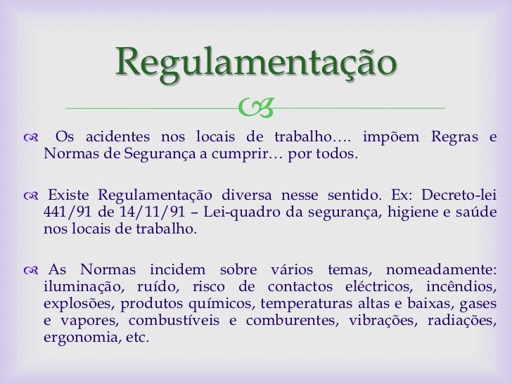 2. 2. Regulamentação  Os acidentes nos locais de trabalho…. impõem Regras e Normas de Segurança a cumprir… por todos. Existe Regulamentação diversa nesse sentido. Ex: Decreto-lei 441/91 de 14/11/91 – Lei-quadro da segurança, higiene e saúde nos locais de trabalho. As Normas incidem sobre vários temas, nomeadamente: iluminação, ruído, risco de contactos eléctricos, incêndios, explosões, produtos químicos, temperaturas altas e baixas, gases e vapores, combustíveis e comburentes, vibrações, radiações, ergonomia, etc.