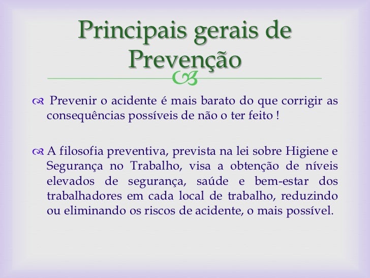 3. 3. Principais gerais de Prevenção  Prevenir o acidente é mais barato do que corrigir as consequências possíveis de não o ter feito ! A filosofia preventiva, prevista na lei sobre Higiene e Segurança no Trabalho, visa a obtenção de níveis elevados de segurança, saúde e bem-estar dos trabalhadores em cada local de trabalho, reduzindo ou eliminando os riscos de acidente, o mais possível.