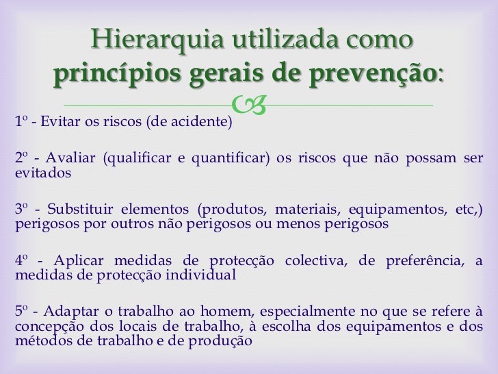 4. 4. Hierarquia utilizada como princípios gerais de prevenção:1º - Evitar os riscos (de acidente) 2º - Avaliar (qualificar e quantificar) os riscos que não possam serevitados3º - Substituir elementos (produtos, materiais, equipamentos, etc,)perigosos por outros não perigosos ou menos perigosos4º - Aplicar medidas de protecção colectiva, de preferência, amedidas de protecção individual5º - Adaptar o trabalho ao homem, especialmente no que se refere àconcepção dos locais de trabalho, à escolha dos equipamentos e dosmétodos de trabalho e de produção
