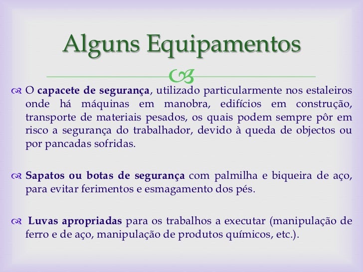 6. 6. Alguns Equipamentos  particularmente nos estaleiros O capacete de segurança, utilizado onde há máquinas em manobra, edifícios em construção, transporte de materiais pesados, os quais podem sempre pôr em risco a segurança do trabalhador, devido à queda de objectos ou por pancadas sofridas. Sapatos ou botas de segurança com palmilha e biqueira de aço, para evitar ferimentos e esmagamento dos pés. Luvas apropriadas para os trabalhos a executar (manipulação de ferro e de aço, manipulação de produtos químicos, etc.).