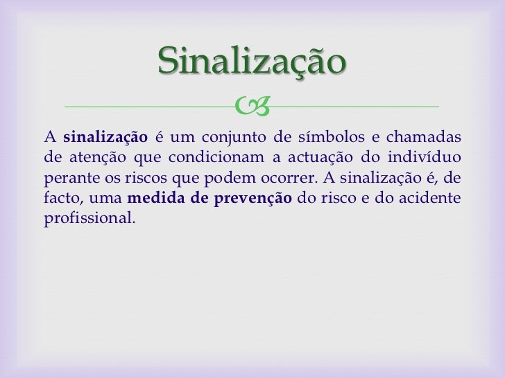 8. 8. Sinalização A sinalização é um conjunto de símbolos e chamadasde atenção que condicionam a actuação do indivíduoperante os riscos que podem ocorrer. A sinalização é, defacto, uma medida de prevenção do risco e do acidenteprofissional.