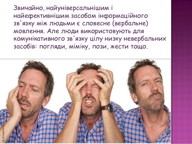 1. 1. Звичайно, найуніверсальнішим і найефективнішим засобом інформаційного зв'язку між людьми є словесне (вербальне) мовлення. Але люди використовують для комунікативного зв'язку цілу низку невербальних засобів: погляди, міміку, пози, жести тощо.