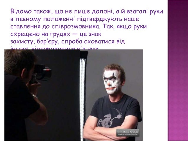 6. 6. Відомо також, що не лише долоні, а й взагалі руки в певному положенні підтверджують наше ставлення до співрозмовника. Так, якщо руки схрещено на грудях — це знак захисту, бар’єру, спроба сховатися від інших, відгородитися від них.