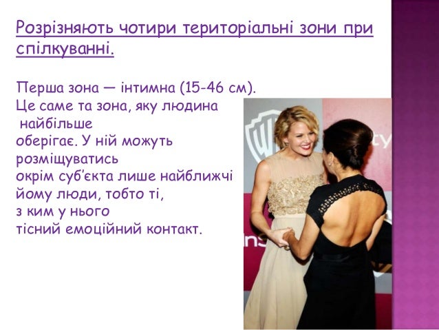 8. 8. Розрізняють чотири територіальні зони при спілкуванні. Перша зона — інтимна (15-46 см). Це саме та зона, яку людина найбільше оберігає. У ній можуть розміщуватись окрім суб’єкта лише найближчі йому люди, тобто ті, з ким у нього тісний емоційний контакт.