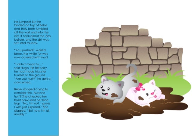 2. 2. He jumped! But he landed on top of Bebe and they both tumbled off the wall and into the dirt! It had rained the day before, and the dirt was soft and muddy. “You pushed!” wailed Bebe. Her white fur was now covered with mud. “I didn’t mean to…” said Hugo. He felt sorry he had made his sister tumble to the ground. “Are you hurt?” he asked, concerned. Bebe stopped crying to consider this. Was she hurt? She checked her front paws and her hind legs. “No, I’m not. I guess I was just surprised.” She giggled. “But now I’m all muddy.”