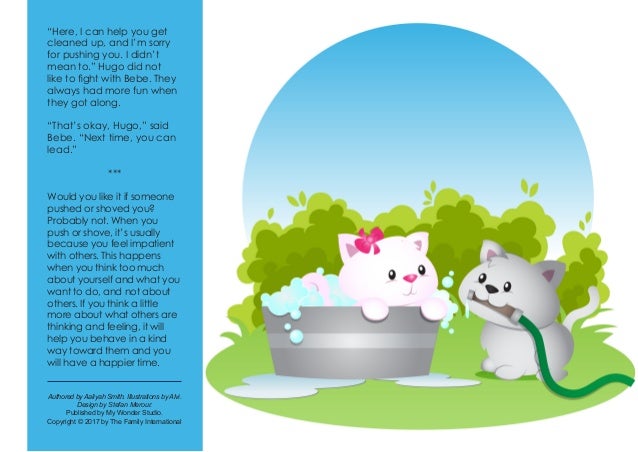 3. 3. “Here, I can help you get cleaned up, and I’m sorry for pushing you. I didn’t mean to.” Hugo did not like to fight with Bebe. They always had more fun when they got along. “That’s okay, Hugo,” said Bebe. “Next time, you can lead.” *** Would you like it if someone pushed or shoved you? Probably not. When you push or shove, it’s usually because you feel impatient with others. This happens when you think too much about yourself and what you want to do, and not about others. If you think a little more about what others are thinking and feeling, it will help you behave in a kind way toward them and you will have a happier time. Authored by Aaliyah Smith. Illustrations by Alvi. Design by Stefan Merour. Published by My Wonder Studio. Copyright © 2017 by The Family International