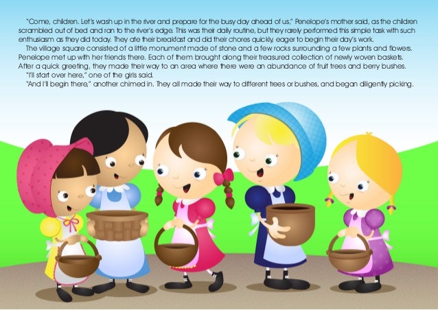2. 2. “Come, children. Let’s wash up in the river and prepare for the busy day ahead of us,” Penelope’s mother said, as the children scrambled out of bed and ran to the river’s edge. This was their daily routine, but they rarely performed this simple task with such enthusiasm as they did today. They ate their breakfast and did their chores quickly, eager to begin their day’s work. The village square consisted of a little monument made of stone and a few rocks surrounding a few plants and flowers. Penelope met up with her friends there. Each of them brought along their treasured collection of newly woven baskets. After a quick greeting, they made their way to an area where there were an abundance of fruit trees and berry bushes. “I’ll start over here,” one of the girls said. “And I’ll begin there,” another chimed in. They all made their way to different trees or bushes, and began diligently picking.