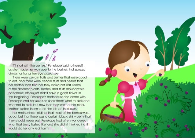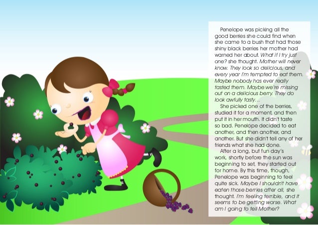 4. 4. Penelope was picking all the good berries she could find when she came to a bush that had those shiny black berries her mother had warned her about. What if I try just one? she thought. Mother will never know. They look so delicious, and every year I’m tempted to eat them. Maybe nobody has ever really tasted them. Maybe we’re missing out on a delicious berry. They do look awfully tasty… She picked one of the berries, studied it for a moment, and then put it in her mouth. It didn’t taste so bad. Penelope decided to eat another, and then another, and another. But she didn’t tell any of her friends what she had done. After a long, but fun day’s work, shortly before the sun was beginning to set, they started out for home. By this time, though, Penelope was beginning to feel quite sick. Maybe I shouldn’t have eaten those berries after all, she thought. I’m feeling terrible, and it seems to be getting worse. What am I going to tell Mother?