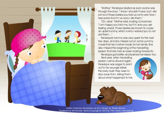 5. 5. “Mother,” Penelope blurted as soon as she was through the door, “I know I shouldn’t have, but I ate some of those berries you told us not to eat. Now I feel awful! And I’m so sorry I ate them.” “Oh, dear,” Mother said, looking concerned. “I am happy you told me, but I’m sorry you are feeling unwell. Those berries are known to cause an upset tummy, which is why I warned you to not eat them…” Penelope’s tummy was very upset for the next few days, and she missed out on some yummy meals that her mother made for her family. She also missed the beginning of the harvesting season that she had so been looking forward to. Penelope got better and learned her lesson too. Next year, when harvesting season came around again, Penelope was eager to point out to her younger sisters the berry bush they were to stay away from, telling them about what happened to her. Author Unknown.Illustrations by Alvi. Design by Stefan Merour. Published by My Wonder Studio Copyright © 2015 by The Family International