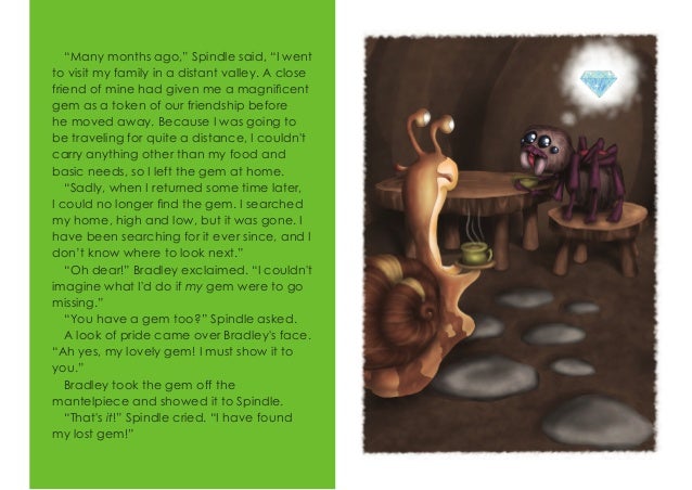 2. 2. So the following day he called on his neighbors and friends, inviting them to see his newfound treasure. Before long, dozens of snails and insects crowded into his house to gaze admiringly at the dazzling gem. Over the next couple of days, Bradley's gem was the talk of the neighborhood; no one had ever seen anything so beautiful. Bradley would carefully polish it each night to make sure it would sparkle “as brightly as the sun's rays.” One chilly evening there was a knock on Bradley's door. It was a traveling spider. “My name is Spindle, sir,” the spider began, “and I was wondering if you'd have a place for me to spend the night.” Bradley invited Spindle in and offered him something to eat. After a warm meal, Bradley asked, “Tell me, Spindle, what brings you on this journey? You seem so far from home.”