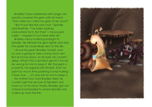 4. 4. Bradley's face reddened with anger. He quickly covered the gem with his hand. “How dare you claim my gem to be yours!” “But it's just like the one I lost,” Spindle said tearfully. “I've been looking everywhere for it. But then”—he paused sadly—“maybe it's not mine after all.” Bradley said a hurried goodnight to Spindle. He still held the gem tightly and told the spider he could sleep next to the fire. I found this gem! Bradley fumed, and no one is going to take it away from me! But as he lay down on his bed, he couldn't sleep. What if this is Spindle's gem? It would be wrong for me to keep it. But the gem is so pretty, he argued with himself. And I've spent so much time polishing it and making it look nice. … It's only fair for me to keep it. No matter how hard Bradley tried, he couldn't get the picture of Spindle's sad face out of his mind. Finally, Bradley got out of bed and headed to where Spindle was curled up near the fire.