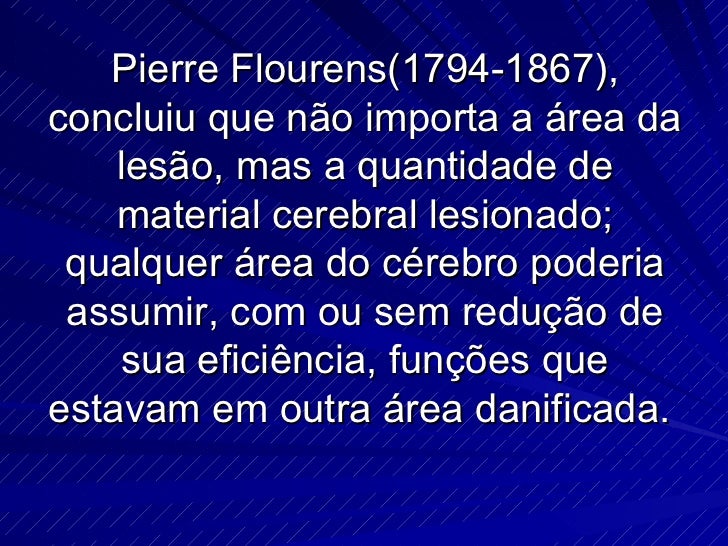 10. 10. Pierre Flourens(1794-1867), concluiu que não importa a área da lesão, mas a quantidade de material cerebral lesionado; qualquer área do cérebro poderia assumir, com ou sem redução de sua eficiência, funções que estavam em outra área danificada.