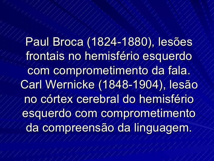11. 11. Paul Broca (1824-1880), lesões frontais no hemisfério esquerdo com comprometimento da fala. Carl Wernicke (1848-1904), lesão no córtex cerebral do hemisfério esquerdo com comprometimento da compreensão da linguagem.
