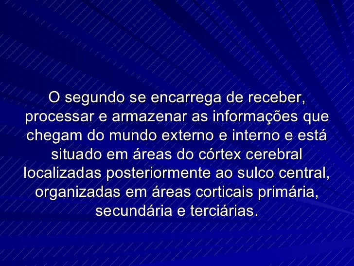 14. 14. O segundo se encarrega de receber, processar e armazenar as informações que chegam do mundo externo e interno e está situado em áreas do córtex cerebral localizadas posteriormente ao sulco central, organizadas em áreas corticais primária, secundária e terciárias.