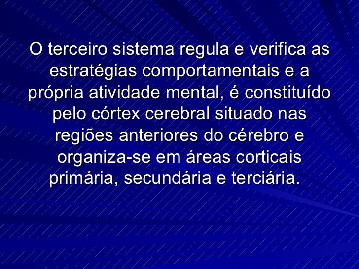 15. 15. O terceiro sistema regula e verifica as estratégias comportamentais e a própria atividade mental, é constituído pelo córtex cerebral situado nas regiões anteriores do cérebro e organiza-se em áreas corticais primária, secundária e terciária.