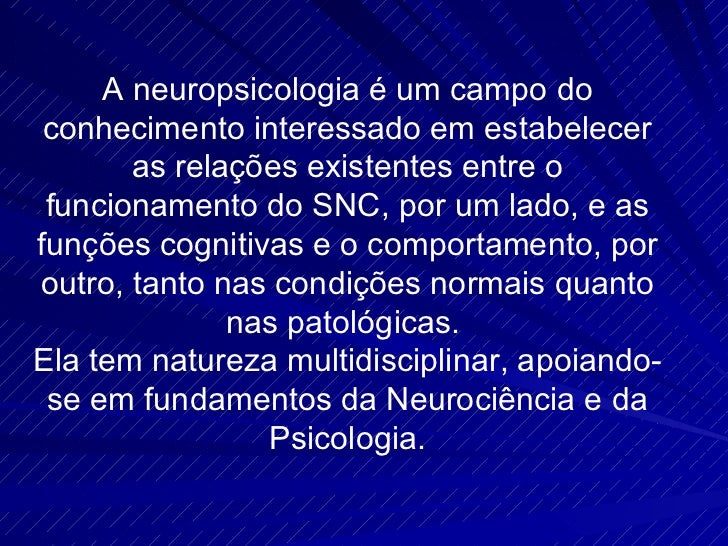 2. 2. A neuropsicologia é um campo do conhecimento interessado em estabelecer as relações existentes entre o funcionamento do SNC, por um lado, e as funções cognitivas e o comportamento, por outro, tanto nas condições normais quanto nas patológicas. Ela tem natureza multidisciplinar, apoiando-se em fundamentos da Neurociência e da Psicologia.