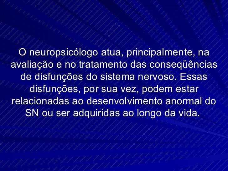 3. 3. O neuropsicólogo atua, principalmente, na avaliação e no tratamento das conseqüências de disfunções do sistema nervoso. Essas disfunções, por sua vez, podem estar relacionadas ao desenvolvimento anormal do SN ou ser adquiridas ao longo da vida.