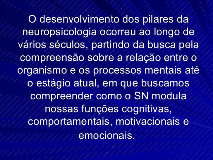 4. 4. O desenvolvimento dos pilares da neuropsicologia ocorreu ao longo de vários séculos, partindo da busca pela compreensão sobre a relação entre o organismo e os processos mentais até o estágio atual, em que buscamos compreender como o SN modula nossas funções cognitivas, comportamentais, motivacionais e emocionais.