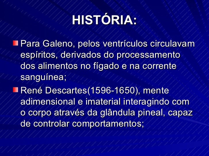 7. 7. HISTÓRIA: <ul><li>Para Galeno, pelos ventrículos circulavam espíritos, derivados do processamento dos alimentos no fígado e na corrente sanguínea; </li></ul><ul><li>René Descartes(1596-1650), mente adimensional e imaterial interagindo com o corpo através da glândula pineal, capaz de controlar comportamentos; </li></ul>