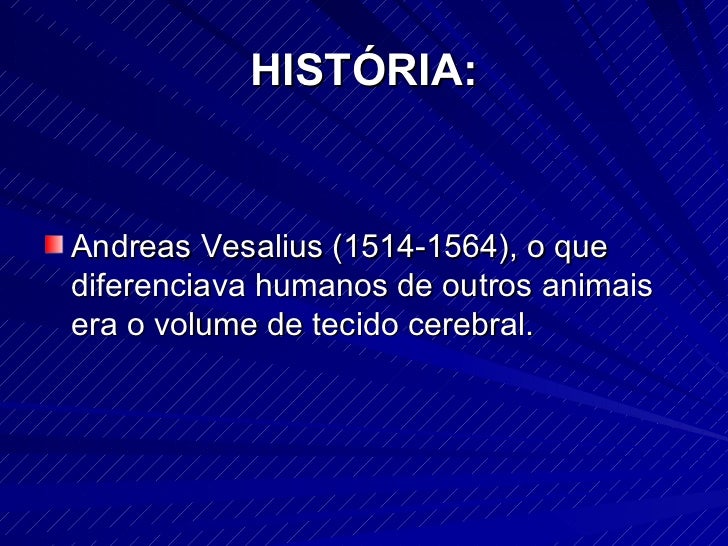 8. 8. HISTÓRIA: <ul><li>Andreas Vesalius (1514-1564), o que diferenciava humanos de outros animais era o volume de tecido cerebral. </li></ul>