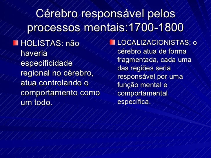 9. 9. Cérebro responsável pelos processos mentais:1700-1800 <ul><li>HOLISTAS: não haveria especificidade regional no cérebro, atua controlando o comportamento como um todo. </li></ul><ul><li>LOCALIZACIONISTAS: o cérebro atua de forma fragmentada, cada uma das regiões seria responsável por uma função mental e comportamental específica. </li></ul>