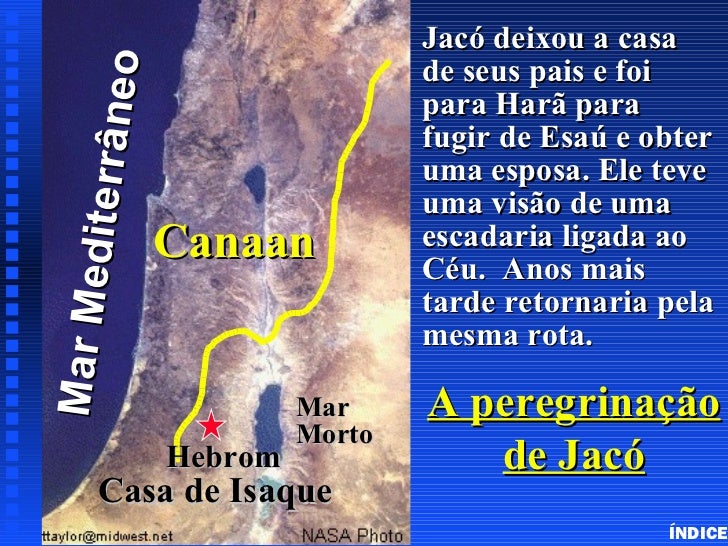 14. 14. Jacó deixou a casa o de seus pais e foi Wandering’s of Jacob Click to add title dit errâ ne para Harã para fugir de Esaú e obter s Click to add text uma esposa. Ele teve uma visão de uma Canaan escadaria ligada ao Céu. Anos maisMa r Me tarde retornaria pela mesma rota. Mar A peregrinação Morto Hebrom de Jacó Casa de Isaque ÍNDICE