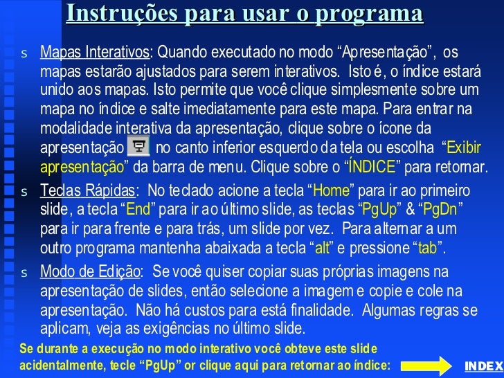 2. 2. Instruções para usar o programas Mapas Interativos: Quando executado no modo “Apresentação”, os Interativos: Apresentação”, mapas estarão ajustados para serem interativos. Isto é, o índice estará interativos. unido aos mapas. Isto permite que você clique simplesmente sobre um mapas. mapa no índice e salte imediatamente para este mapa. Para entrar na mapa. modalidade interativa da apresentação, clique sobre o ícone da apresentação no canto inferior esquerdo da tela ou escolha “Exibir “Exibir apresentação” apresentação” da barra de menu. Clique sobre o “ÍNDICE” para retornar. “ÍNDICE”s Teclas Rápidas: No teclado acione a tecla “ Home” para ir ao primeiro Rápidas: “Home” slide, a tecla “ End” para ir ao último slide, as teclas “PgUp” & “PgDn” “End ” “PgUp” “PgDn ” para ir para frente e para trás, um slide por vez. Para alternar a um vez. outro programa mantenha abaixada a tecla “ alt” e pressione “ tab”. “alt” “tab ”.s Modo de Edição: Se você quiser copiar suas próprias imagens na Edição: apresentação de slides, então selecione a imagem e copie e cole na apresentação. apresentação. Não há custos para está finalidade. Algumas regras se finalidade. aplicam, aplicam, veja as exigências no último slide.Se durante a execução no modo interativo você obteve este slideacidentalmente, tecle “PgUp” or clique aqui para retornar ao índice: INDEX