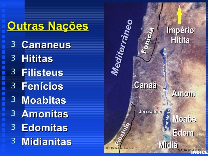 20. 20. Nations of CanaanOutras Nações ne o Império ícia Hitita it err â3 Cananeus Fen Galiléia3 Hititas M ed Jordão3 Filisteus3 Fenícios Canaã Rio Amom3 Moabitas Amonitas Jerusalém to3 Mar Mor Moabe3 Edomitas éi a Edom is t3 Midianitas Midiã F il © EBibleTeacher.com NASA PHOTO ÍNDICE