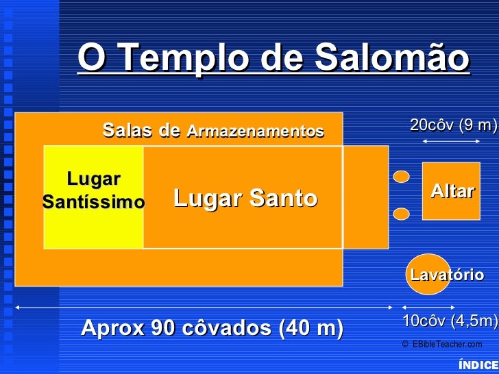 25. 25. O Templo de Salomão Solomon’s Temple Salas de Armazenamentos 20côv (9 m) Lugar Lugar Santo AltarSantíssimo Lavatório 10côv (4,5m) Aprox 90 côvados (40 m) © EBibleTeacher.com ÍNDICE