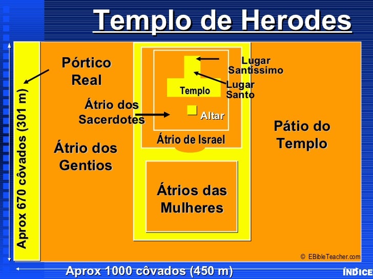 26. 26. Templo de Herodes Herod’s Temple Pórtico Lugar Santíssimo Real Lugar Templo SantoAprox 670 côvados (301 m) Átrio dos Sacerdotes Altar Pátio do Átrio de Israel Templo Átrio dos Gentios Átrios das Mulheres © EBibleTeacher.com Aprox 1000 côvados (450 m) ÍNDICE