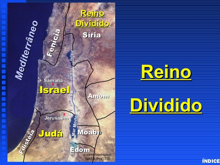 27. 27. Reino Dividido Divided Kingdom of Israel âne o Síria ícia Fen iterr Galiléia ReinoMed Jordão Samaria Israel Rio Amom Jerusalém Dividido to Mar Mor Judá Moabe éi a ist Edom F il © EBibleTeacher.com NASA PHOTO ÍNDICE