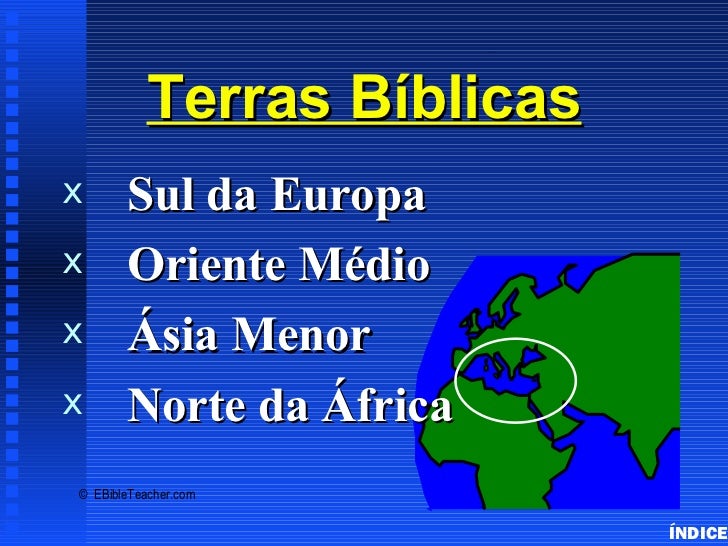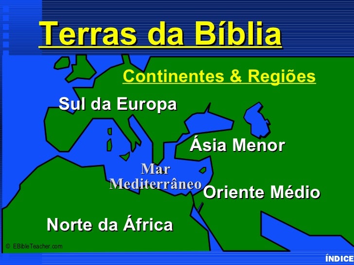 3. 3. Bible Lands Overview Terras Bíblicasx Sul da Europax Oriente Médiox Ásia Menorx Norte da África© EBibleTeacher.com ÍNDICE