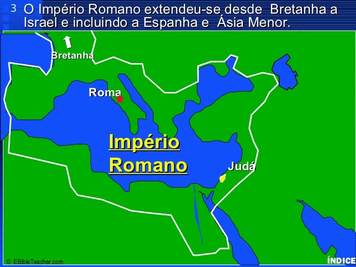32. 32. 3 O Império Romano extendeu-se desde Bretanha a Israel e incluindo a Espanha e Ásia Menor. Roman Empire BretanhaClick to add title • ClickRoma to add text Império Israel Romano Judá© EBibleTeacher.com ÍNDICE