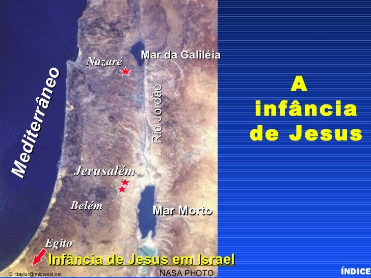 34. 34. Childhood of Jesus Mar da Galiléia Nazaré A o rân e Rio Jordão infância de Jesus iterMe d Jerusalém Belém Mar Morto Egito Infância de Jesus em Israel© ttaylor@midwest.net NASA PHOTO ÍNDICE